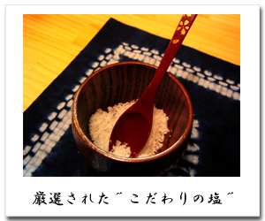 大分県南の米水津村、太平洋の荒波が入ってくる間越(はざこ)海岸で作られた天然海塩『なずなの塩』 ミネラル豊富でとても体に良い自然塩です。 ご来店してまず味わって見て下さい。天然塩だけがもつ甘さと味の違いがすぐ実感できます。 料理の素材はもちろんの事、"はろ"は、味付けの決め手となる塩にまでこだわり抜きます。